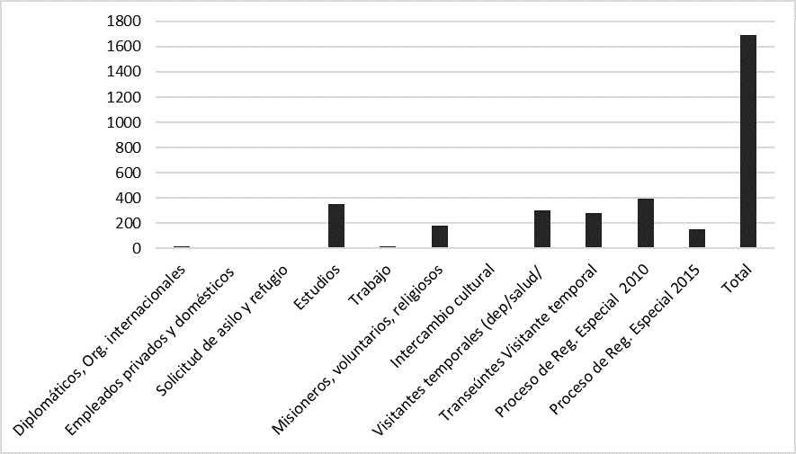 Al analizar el número y tipo de visas otorgadas entre 2010 y marzo de 2016, se observa en primer lugar que se otorgaron 349 visas de estudiante y solamente 11 de trabajo. Se entregaron 180 visas para misioneros y voluntarios religiosos y 301 de visitantes temporales con fines específicos (deporte, salud, ciencia, arte, comercio). Solo 277 de transeúntes y visitantes temporales. Finalmente, como ya se comentó, se entregaron 392 como parte del proceso de regularización de 2010 y 153 como parte del proceso de regularización especial de 2015, que como se verá más adelante acompañaba a la imposición de la solicitud de visa de turista para haitianos, lo que en términos eufemísticos y legales se denominó el Sistema de Validación Turística. Como muestra el gráfico siguiente, el número total de visas entregadas a ciudadanos haitianos durante el periodo analizado fue de 1695, un número bastante reducido para la cantidad de personas que permanecieron en el país, lo que nos habla de un fuerte proceso de irregularización.