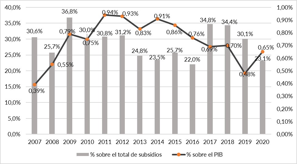 Gráfico 1. Subsidios al transporte[13] como porcentaje del total de subsidios económicos y porcentaje sobre el PIB, 2007-2020