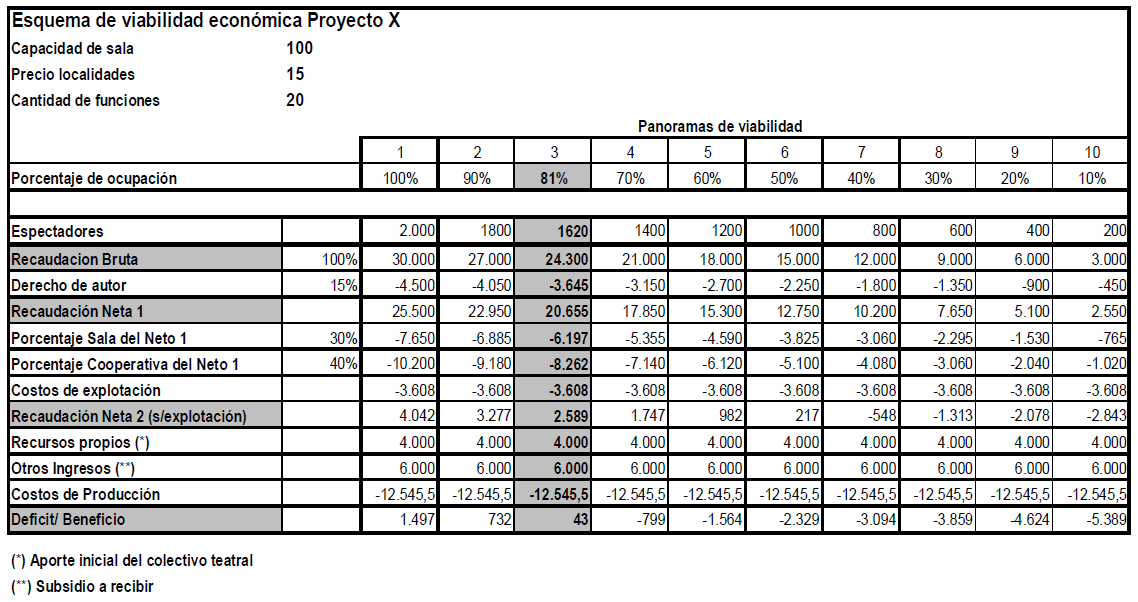 el resultado de los cálculos matemáticos necesarios para conocer el punto en el que los gastos y los ingresos se equilibran y cuál es el porcentaje de público necesario en la sala para recuperar la inversión (…). Esta información posibilita deducir si el proyecto es económicamente viable; reconocer si es necesario gestionar patrocinios para evitar pérdidas; disminuir el monto de los gastos; o reconsiderar el precio de los boletos para incrementar los ingresos, entre otras conclusiones. (76)