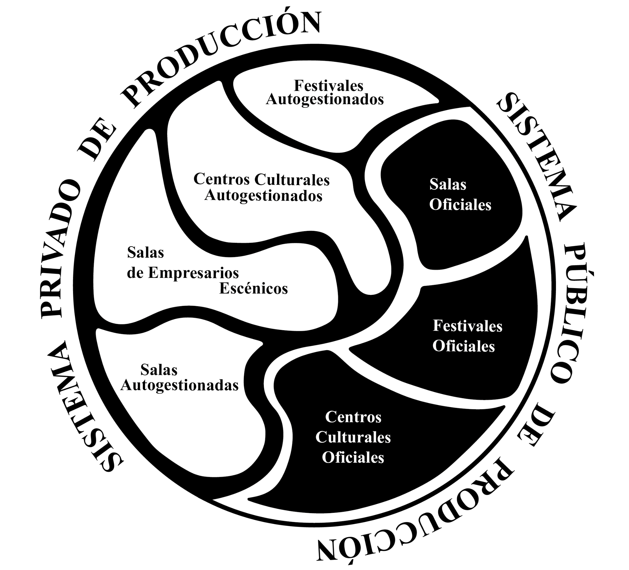 Esta capacidad de agencia está restringida por la estructura del campo y la forma del capital. En este sentido, las distintas formas del capital son claves para comprender los campos y, particularmente, el de las artes escénicas. Las primeras instituciones de este campo en nuestro país surgieron en los comienzos del siglo XX, pero puede contemplarse también el avance en décadas posteriores con la creación de instituciones como el Fondo Nacional de las Artes (1958) o, posteriormente y con fines específicos, el Instituto Nacional del Teatro (1997) o el Régimen de Concertación para la Actividad Teatral No Oficial de la Ciudad Autónoma de Buenos Aires (1999), conocido también como Proteatro. Todos ellos, espacios públicos donde los agentes del campo deberían discutir las políticas culturales del territorio.