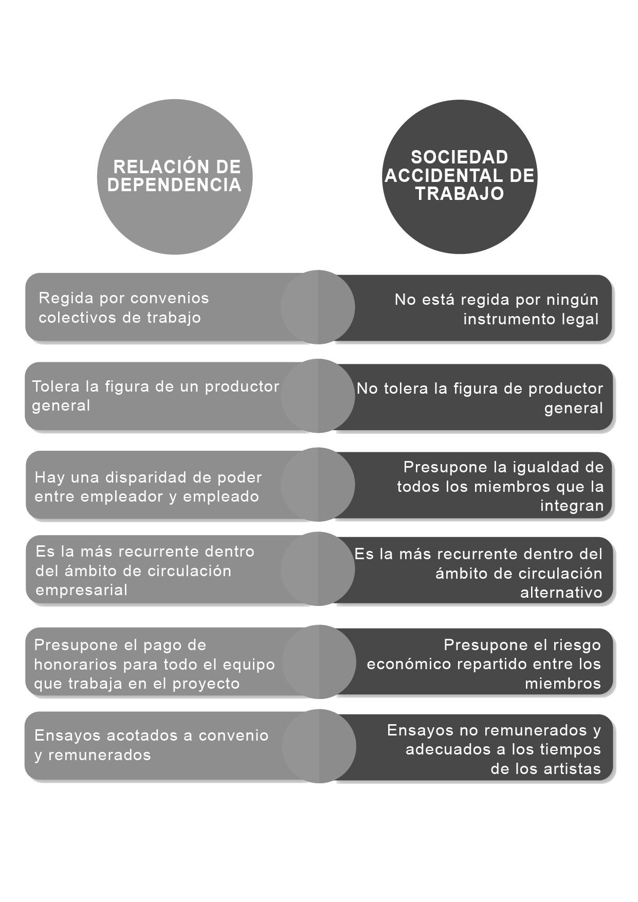 En el modelo de producción empresarial, regido por el Convenio 307/73, el productor persigue un tipo de estrategia encolumnada en lo que Bourdieu denomina de inversión económica en sentido acotado, puesto que al ser él quien paga sueldos y jornales a todo agente cultural del campo vinculado a su proyecto, debe afrontar con su espalda económico-financiera la pérdida total del proyecto (o beneficiarse con la ganancia, en caso de que corresponda). Ahora bien, dado que la propia configuración “estatutaria” de la denominada sociedad accidental de trabajo que se suscribe en la Asociación Argentina de Actores y Actrices no permite la obtención de intereses sobre el capital económico que se invierte en una producción, se puede deducir, por saberse esto a priori, que el productor escénico que lleva adelante un proyecto autogestivo no lo hace con una estrategia de inversión económica puesto que no tiene capacidad “formal” de ensanchar su capital a través de esa producción. Así, podría pensarse que el accionar de un productor en este marco está vinculado a una estrategia de inversión económica pero con una variación, ya que sus estrategias no buscan el incremento del capital económico en sentido acotado sino que están