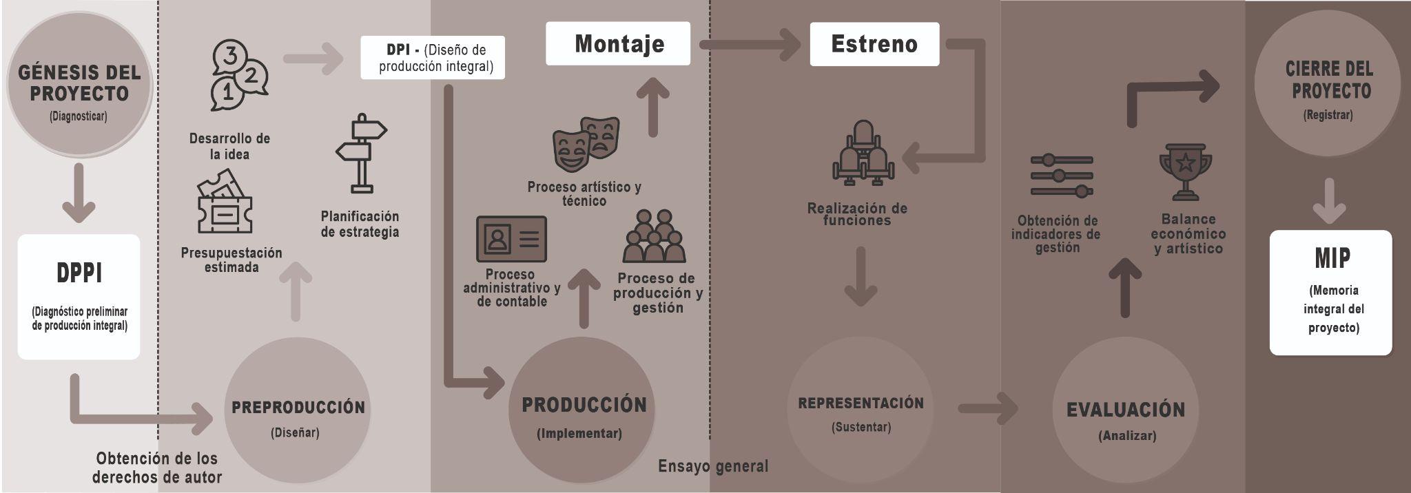 Por su parte, la definición de Algán y Berstein (2022) actualiza la mirada de Schraier (2008) puesto que introduce a los públicos y el análisis contextual en la condición integral de la producción. No es un salto paradigmático en la concepción de la práctica, es decir, del proceso de producción, sino que es un crecimiento cualitativo. Por un lado, los autores agregan dos fases a la concepción de la producción (representación y evaluación), indicando así que la producción abarca todo el ciclo y no culmina en el estreno. Schraier plantea, en este sentido, que la producción debe “llegar al destino final del viaje” (16) cuando la obra se estrena, momento en el cual el proyecto se transforma en espectáculo. Algán y Berstein (2022), por su parte, plantean que la práctica del productor no concluye en el estreno, sino que se extiende hasta la escritura de la memoria final del proyecto, por tanto, acabado todo el proceso. La siguiente ilustración es explicativa de la concepción que se menciona.