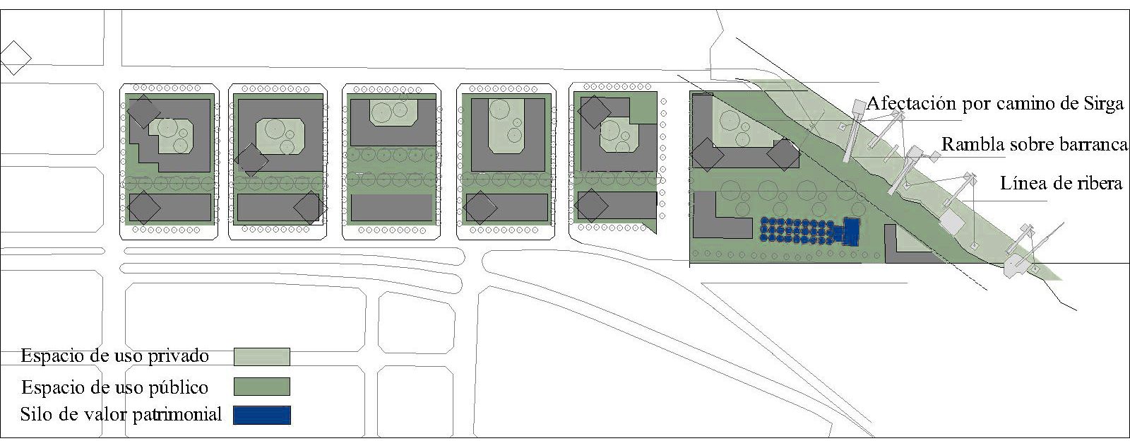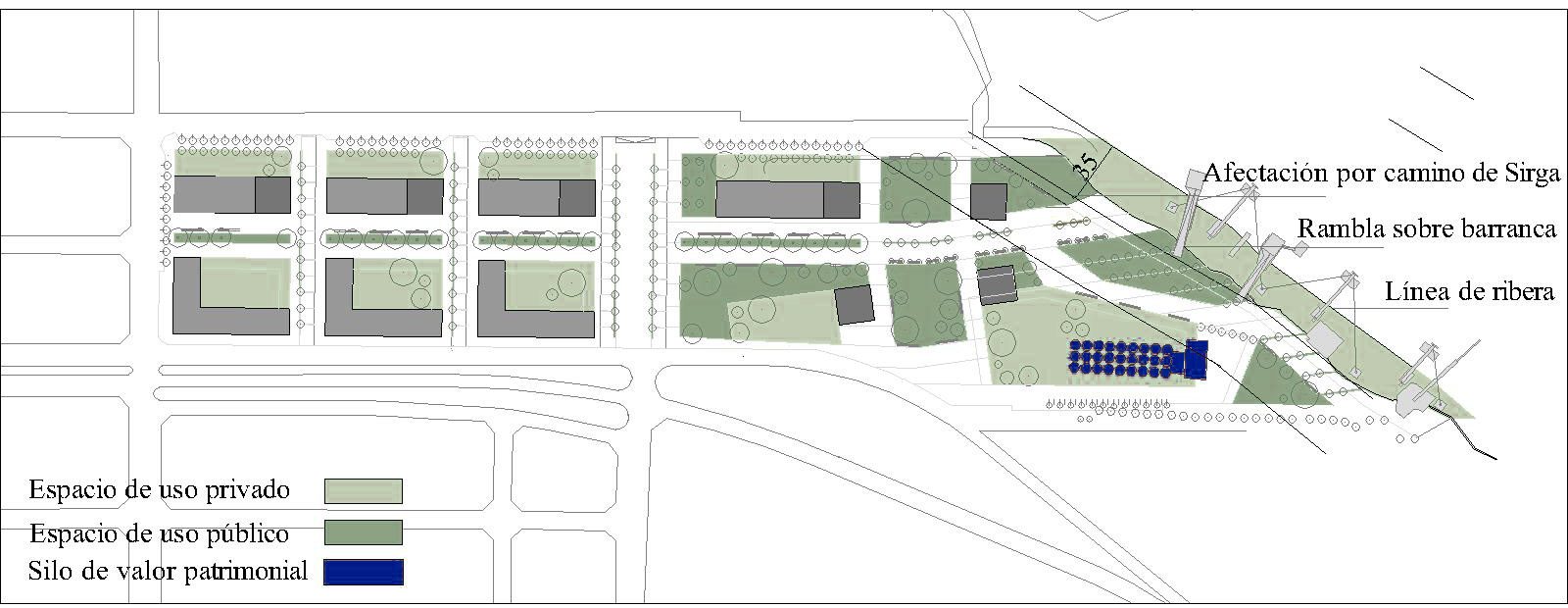 Se deberá respetar en toda la extensión los 35 metros correspondientes al camino de sirga establecido en el Art. 2340, inciso 4 y 2639 del Código Civil, y garantizar además, como mínimo, la libre circulación pública en toda la zona comprendida desde la línea del borde superior de la barranca actual hasta los 34 metros medidos perpendicularmente a esta, y hacia el oeste, con excepción de la superficie afectada a las construcciones autorizadas por la presente Ordenanza (Municipalidad de Rosario. Ordenanza N.° 8320/08. Plan de Detalle ug 1 y 6. Artículo 7: Indicadores Urbanísticos y Usos del Suelo).