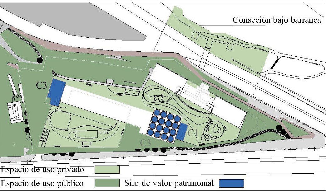 En el caso de la Unidad de Gestión N.° 6, la preocupación por la conservación del valor patrimonial se verificó en la sectorización de los silos a preservar y la designación como de “protección total” para aquellos nomenclados como C1, C2 y C3 (figura 4). Esto implicaba que “no se los podrá demoler ni reemplazar por nuevas construcciones, permitiéndose reestructuraciones del interior, respetando la volumetría, materialidad y los procedimientos constructivos originales” (Ordenanza Complementaria N.° 8320-08). En cuanto a la incorporación de espacios públicos, el Convenio Urbanístico estableció, además de la superficie afectada como “servidumbre administrativa de uso público”, la obligación de ejecutar obras en el Parque de la Arenera según el anteproyecto propuesto por la Secretaría de Planeamiento.