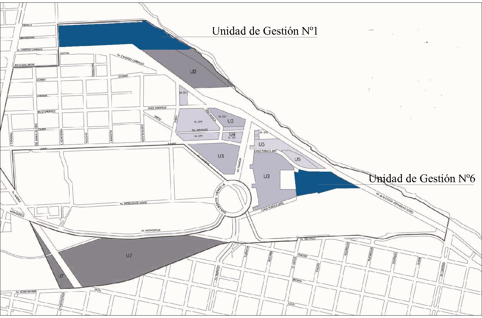 - Se trata de un predio de 80.000 m² cuyo desarrollo se había determinado en etapas, según 5 áreas de intervención denominadas “unidad de ejecución de proyecto”. Estas unidades tenían el objetivo de “permitir su organización ejecutiva a través de diferentes consorcios, fideicomisos, sociedades comerciales, uniones transitorias de empresas u otras modalidades de organización empresarial que puedan proponerse” (Ordenanza N.° 8320/08).↵