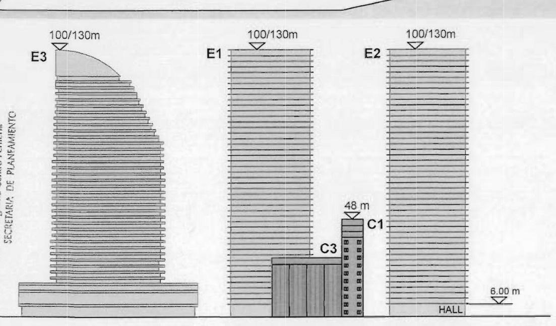 En la comparación gráfica entre la vista del proyecto original y la del proyecto modificado (figuras 6 y 7), puede observarse que el resultado de esta negociación modificó sustancialmente la configuración espacial resultante. Esto se produjo no solo a partir de la eliminación del silo (C2) que había sido considerado de “protección total”, sino también a partir del incremento de la capacidad constructiva para el nuevo edificio destinado al hotel (E3).