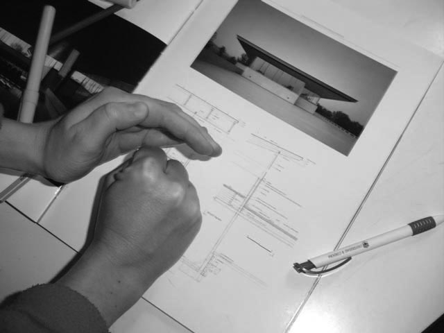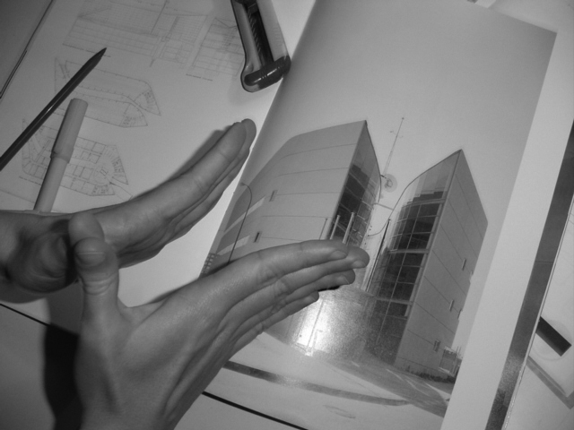 Un modo frecuente de expresión en el estudiante es la utilización de las manos como mímica para relatar la propuesta. En esta forma de expresión, los ademanes son modos espontáneos de gran valor plástico que se utilizan para remarcar ideas: se puede señalar la relación entre volumen y plano, entre espacio cerrado y cubierta. También indicar de un modo simbólico la estructura portante, el sentido radial del espacio o el entrelazado de formas que se intenta adoptar en el proyecto.
