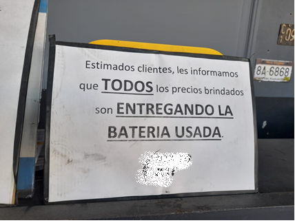 Según los manuales titulados Manejo ambientalmente adecuado de acumuladores al final de su vida útil (Convenio de Basilea, 2015) y Las directrices técnicas para el manejo ambientalmente racional de desechos de acumuladores de plomo (Convenio de Basilea, 2021), la recolección y transporte de las BAPU debe hacerse por un sistema de distribución inversa. Esto significa que quienes venden las baterías nuevas deben recolectar y acopiar las usadas. Así, los fabricantes pueden recogerlas, enviarlas a las empresas transformadoras o transformarlas por sí, y de esta manera minimizar los posibles daños a la salud y al ambiente. También se reconoce la posibilidad de que esta tarea quede en manos de acopiadores. Sin embargo, en estos casos, quienes son responsables de la recepción tienen que estar inscriptos en registros jurisdiccionales y contar con un operador autorizado para el traslado y tratamiento de las BAPU. En Argentina, esto ocurre, sobre todo cuando son casas especializadas en la venta de estos artículos. En general, como puede observarse en la imagen 1, en dichos lugares, se les ofrece un precio especial a los clientes, si dejan sus BAPU.