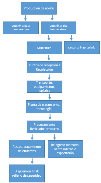 Del proceso de gestión de esta corriente de residuos, participan diversos actores: productores de aceite, consumidores de aceite, cooperativas de recicladores, empresas de recolección, entre otros (Epifanio y Ernest, 2019).