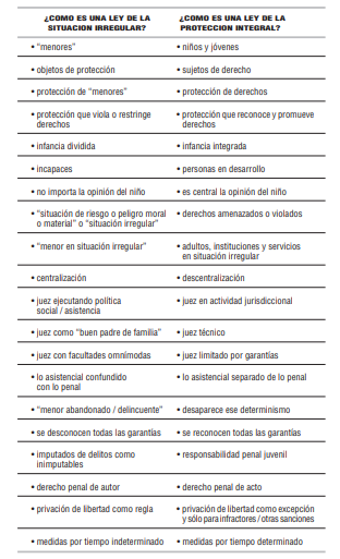 En relación a estos cambios, que marcaron el pasaje de la situación irregular a la protección integral, resulta ilustrativo el cuadro propuesto por Beloff, quien señala con toda claridad las diferencia entre ambos paradigmas, diferencia que tuvieron su correlato en las discusiones parlamentarias de cara a la sanción de los diversos cuerpos normativos.