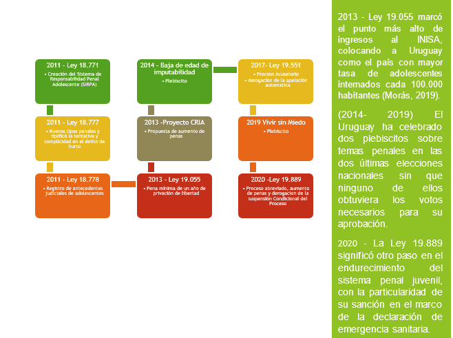 Esquemáticamente, es posible señalar que en el período que va desde el 2011 al 2022, existieron seis reformas legislativas y tres proyectos de reforma, tal como lo muestra el siguiente cuadro. Asimismo, es importante reparar en que tres de ellas repercutieron significativamente en todo el sistema, ya sea por lo regresivo de los cambios (Ley 19.055 y 19.889) o por la discusión pública en torno a la responsabilidad penal juvenil (baja de la edad de imputabilidad penal).