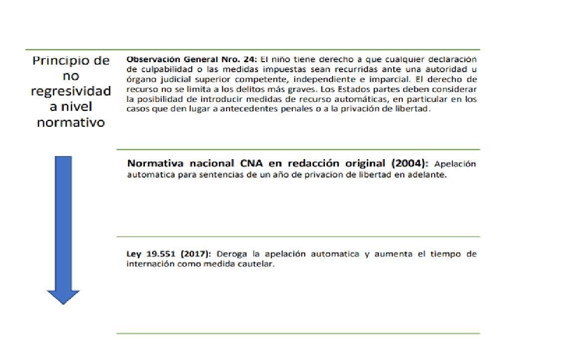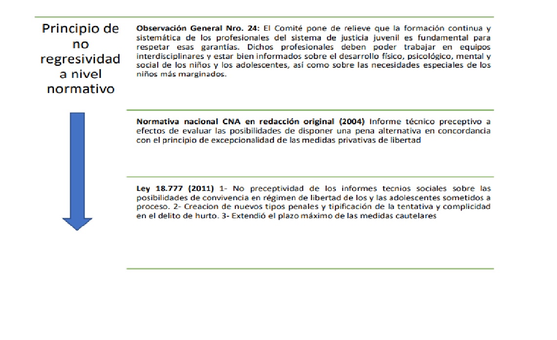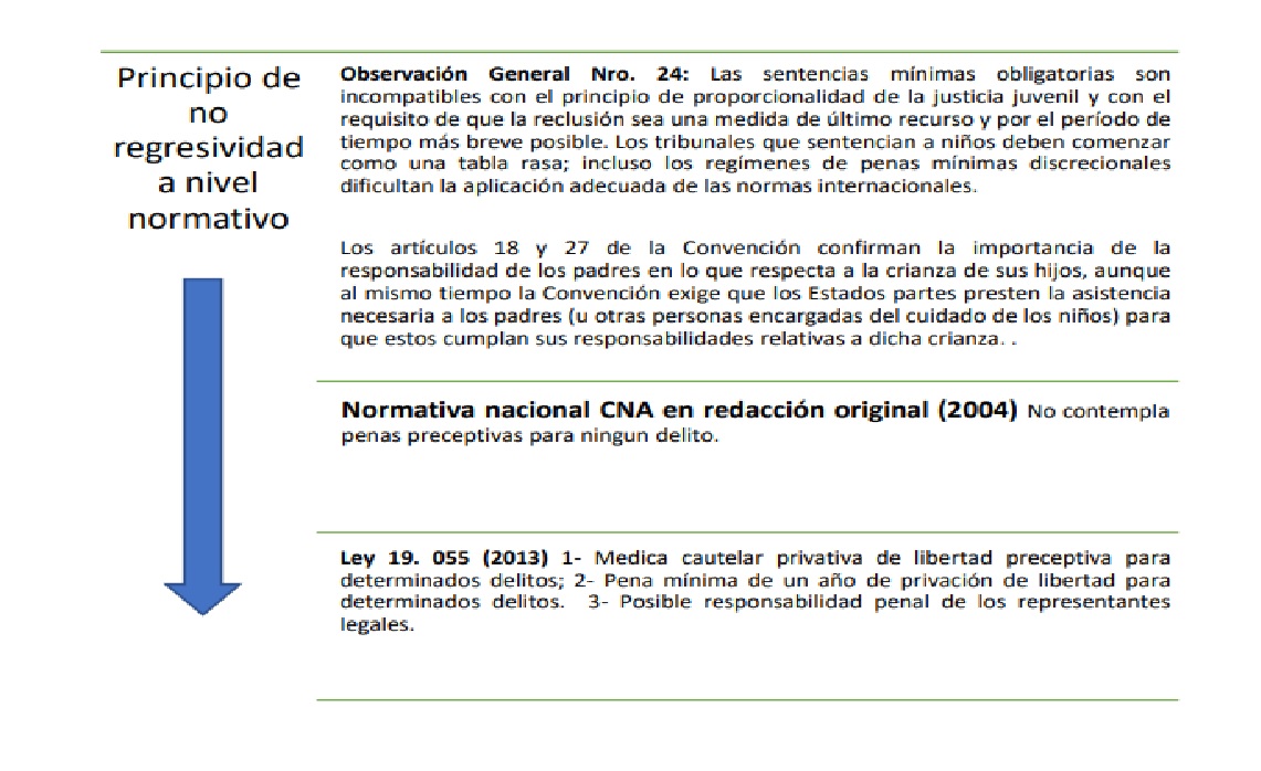 Esta regresividad normativa se expresa en el apartamiento del principio de excepcionalidad de la medida privativa de libertad y mínima duración, principio vulnerado por las Leyes 19.055 y 19.889 al establecer penas preceptivas de privación de libertad. Si analizamos el marco jurídico vigente, a la luz de la Observación General Nro. 24, es posible afirmar que la normativa interna quebranta claramente la normativa internacional, desvirtuando los postulados básicos de la CDN, pasando de un abordaje que toma a los y las adolescentes como sujetos de derecho a uno que prioriza el componente punitivo y los coloca como objeto de la intervención penal.