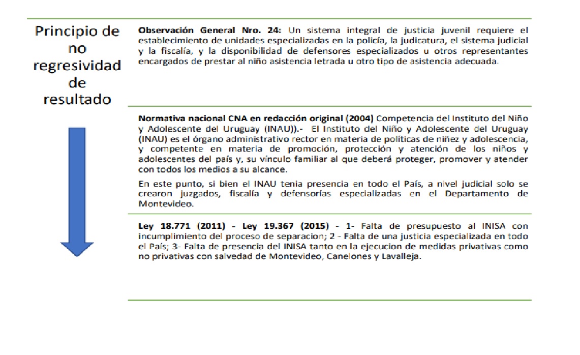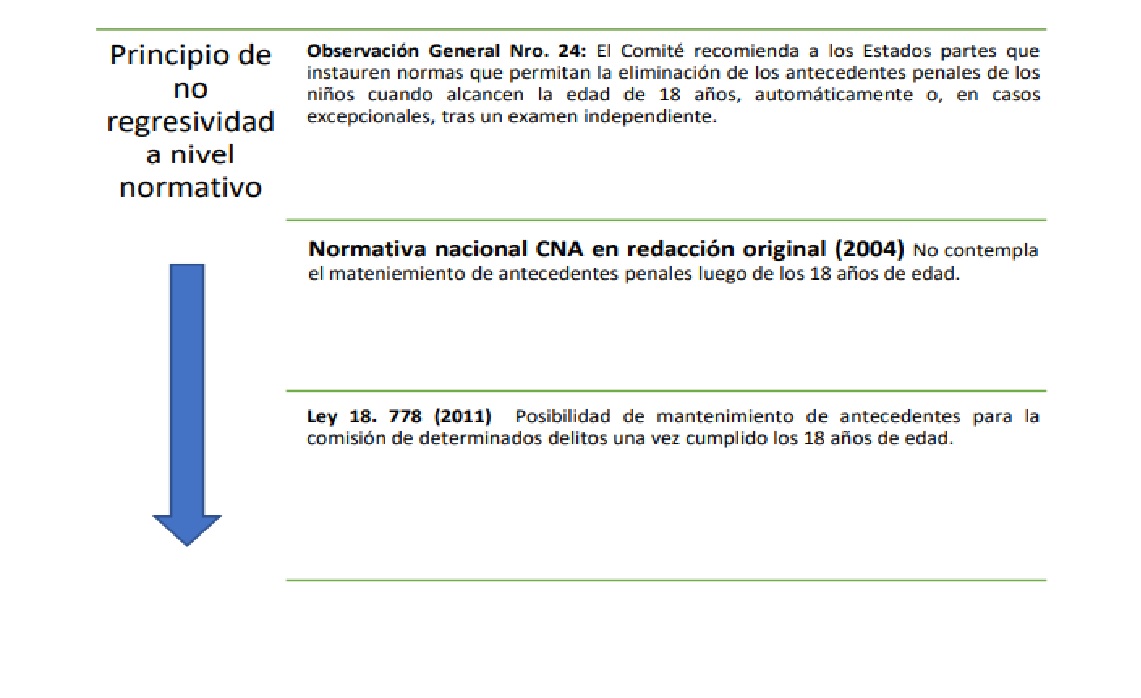 El recorrido realizado en este capítulo permitió constatar, como luego de cada reforma, el sistema penal juvenil uruguayo fue incorporando aspectos regresivos, que contravienen la Convención sobre los Derechos del Niño a la luz de los planteos realizados en la Observación General Nro. 24 (2019). Este proceso da cuenta de una vulneración del principio de no regresividad en materia de derechos humanos, fundamentalmente en su aspecto normativo.