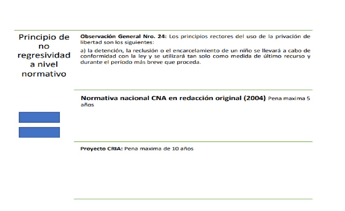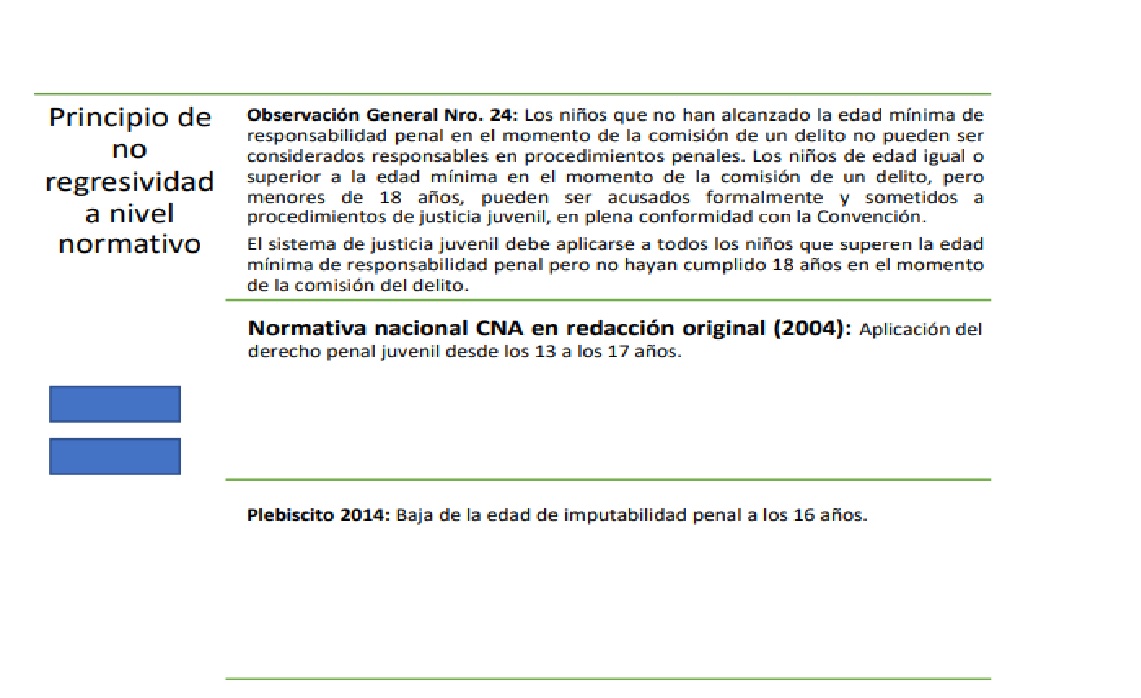 Un análisis de estas características implica tomar a la Convención sobre los Derechos del Niño como un piso mínimo de protección desde el cual analizar la eventual regresividad de los sistemas penales internos. En este sentido, el análisis de los marcos jurídicos, en base al principio de no regresividad, implica partir de lo establecido en los Artículos 37 a 40 de la CDN[3]; de acuerdo a la interpretación dada por el Comité de los Derechos del Niño en su Observación General Nro. 24[4] de fecha 18 de septiembre de 2019. Esta Observación realizada por el Comité, se constituye como una interpretación autorizada de los artículos de la CDN, realizada por expertos en la materia, que destaca y contextualiza algunos aspectos centrales del cambio de paradigma.