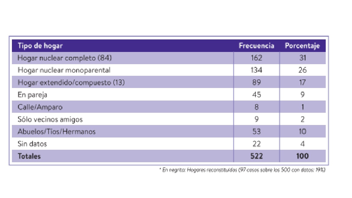 Otro aspecto regresivo de la Ley 19.055, refirió a la obligación del Juez de comunicar al juzgado penal de adultos los hechos a efectos de evaluar la presunta responsabilidad de los representantes legales de los y las adolescentes. La norma extendió el control penal sobre los integrantes de la familia, haciendo caso omiso a un dato relevante, relativo a que un amplio porcentaje de estas familias están integradas por más de tres niños, niñas y adolescentes con una gran presencia de hogares nucleares monoparentales, en donde el adulto responsable en la mayoría de los casos es la madre del adolescente, quien oficia como jefa de hogar (Morás, 2016) Ilustrativo de esta situación son los datos presentados en el estudio de trayectorias de vida de adolescentes en conflicto con la ley, de donde surge que los hogares monoparentales, en su enorme mayoría, tienen como jefa de hogar a la madre (2016, 47)