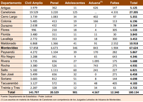 Estas diferencias entre el flujo de trabajo en materia penal juvenil en Montevideo y el resto del país queda en evidencia, si contrastamos la cantidad de asuntos con el número de defensores/as que atienden los diversos temas. En Montevideo existen 4 defensores/as para 345 asuntos iniciados, mientras que en Canelones y Maldonado (los dos departamentos luego de Montevideo con mayor cantidad de asuntos penales y penales juvenil), tienen 17 y 5 Defensores/as para un total de 3345 y 1407 asuntos iniciados respectivamente lo que abarca tanto la materia penal como penal juvenil.