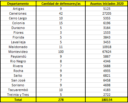 Esta problemática se ve agravada por la falta de defensores/as a nivel nacional. Actualmente en Uruguay existen 278 defensores/as que se ocupan de todas las materias que llegan a los tribunales, concentrado la mayor cantidad en los departamentos de Canelones con 42 defensore/as y Montevideo con 100 defensore/as.