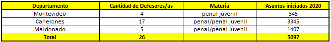 Esta problemática no ocurre en Montevideo, ya que si bien la cantidad de asuntos iniciados es importante (6673 en materia penal y 346 en adolescente) las defensorías se encargan de una única temática. Si comparamos este dato con los asuntos iniciados en los departamentos de Canelones con 3220/125 y Maldonado con 1366/41 en materia penal de adultos y adolescentes, es posible observar la centralidad que ocupan los procesos penales de adultos en el trabajo de las defensorías y el peligro de repetir prácticas del sistema penal adultos en el sistema penal juvenil sin respetar la especificidad de este último.
