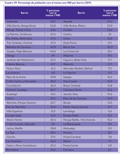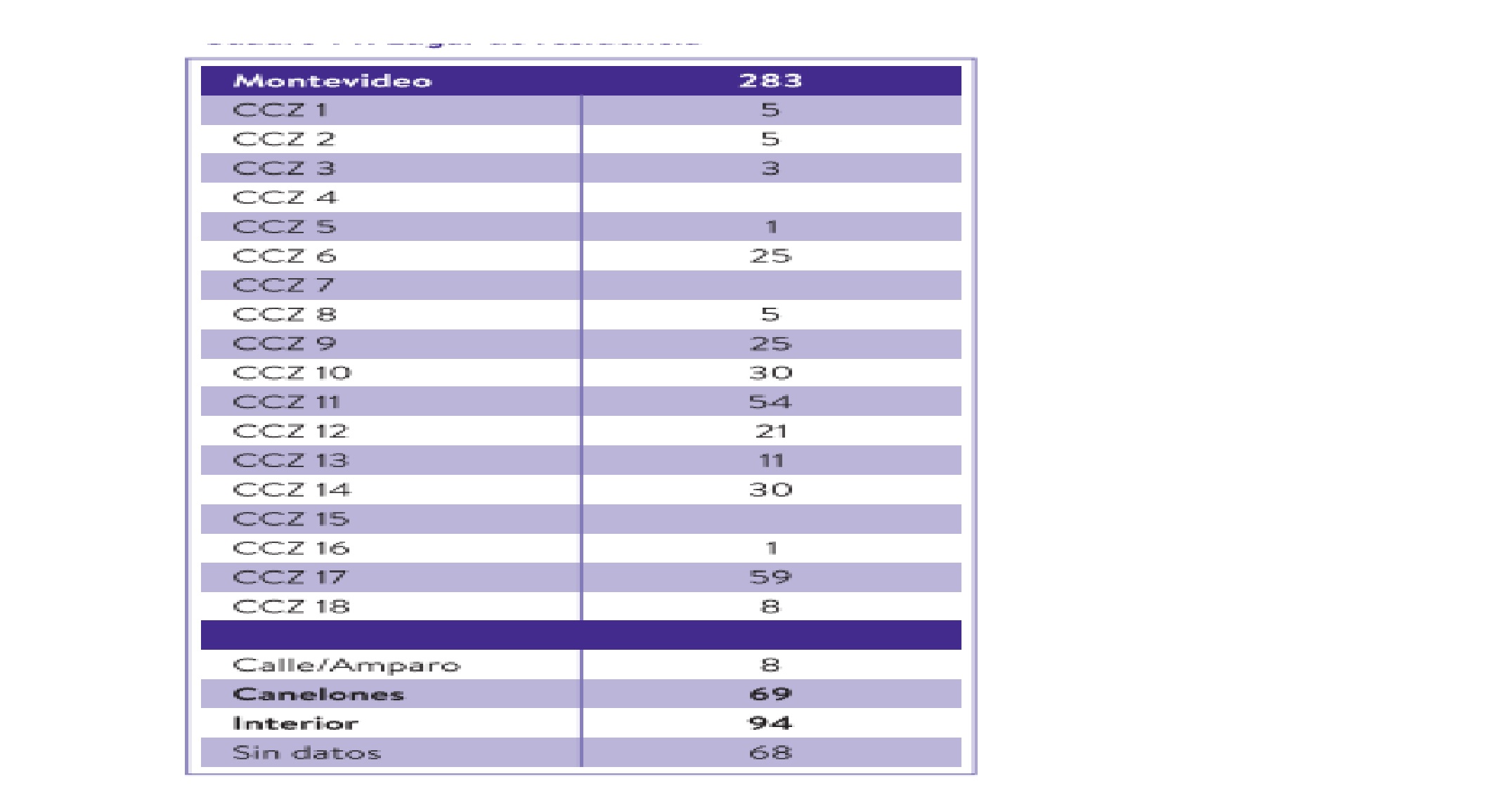 Como dato relevante, el estudio concluye que en forma coincidente con estudios anteriores (UNICEF, 2018; Diaz, 2014) el 43% de los adolescentes internados con una medida privativa de libertad residen en zonas que presentan los peores indicadores sociales (CCZ 17,11,10,14,6 y 9). Estos adolescentes en su gran mayoría provienen de los siguientes barrios: Casabó – Pajas Blancas, La Paloma, Tomkinson, Tres Ombúes, Victoria, Manga – Toledo Chico, Jardines del Hipódromo, Villa Garcia, Bella Italia, Casavalle, La Teja, Cerro, Cerro Norte, Maroñas, Piedras Blancas, Punta de Rieles, Manga, entre otros.