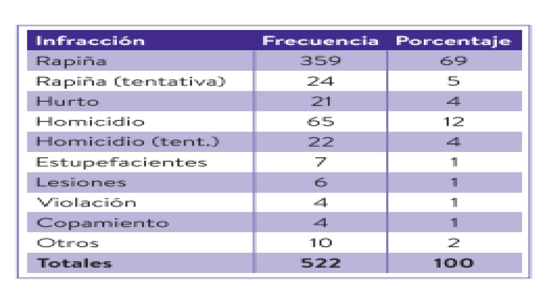 Se observa, en concordancia con los datos publicados por el Poder Judicial (2020) que la mayor concentración de delitos se encuentra en los delitos contra la propiedad. En relación a este punto se observa un amplio predominio del delito de rapiña, siendo la propiedad el bien jurídico tutelado con mayor intensidad. De esta forma, el 74 % de las tipificaciones realizadas refirió al delito de rapiña, mientras que el homicidio se ubicó en un 16 % y el delito de violación se colocó en un 1 %.