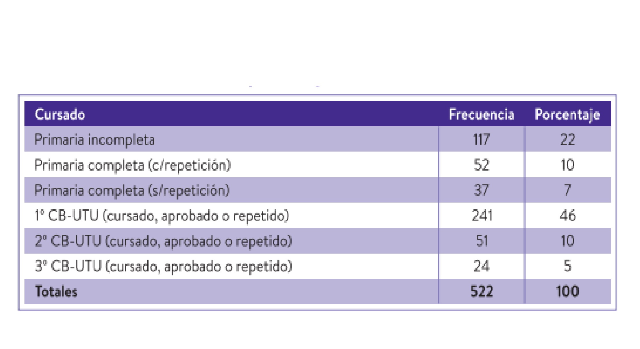 La población adolescente privada de libertad mantiene las principales características destacadas en estudios anteriores: tiene un muy alto nivel de masculinización (98%), su promedio de edad se ubica en 17 años y una tercera parte de ellos tienen 18 años o más, muy bajo nivel de educación formal (85% no completan ciclo básico antes de ingresar), incidencia desproporcionadamente alta de institucionalización en el Sistema de Protección 24 horas de inau en comparación con el resto de la población adolescente, y la mayoría de esta población tiene o tuvo familiares privados de libertad (INISA- UNICEF, 2021:45).