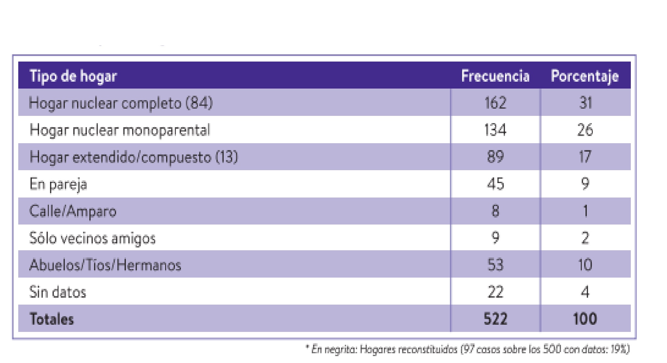 Los datos presentados en el estudio muestran un importante porcentaje de hogares nucleares mono-parentales, el cual asciende a un 26%. En estos casos el adulto responsable es la madre del joven, quien oficia como jefe/a de hogar, cargando con todas las responsabilidades inherentes al ejercicio de la patria potestad.