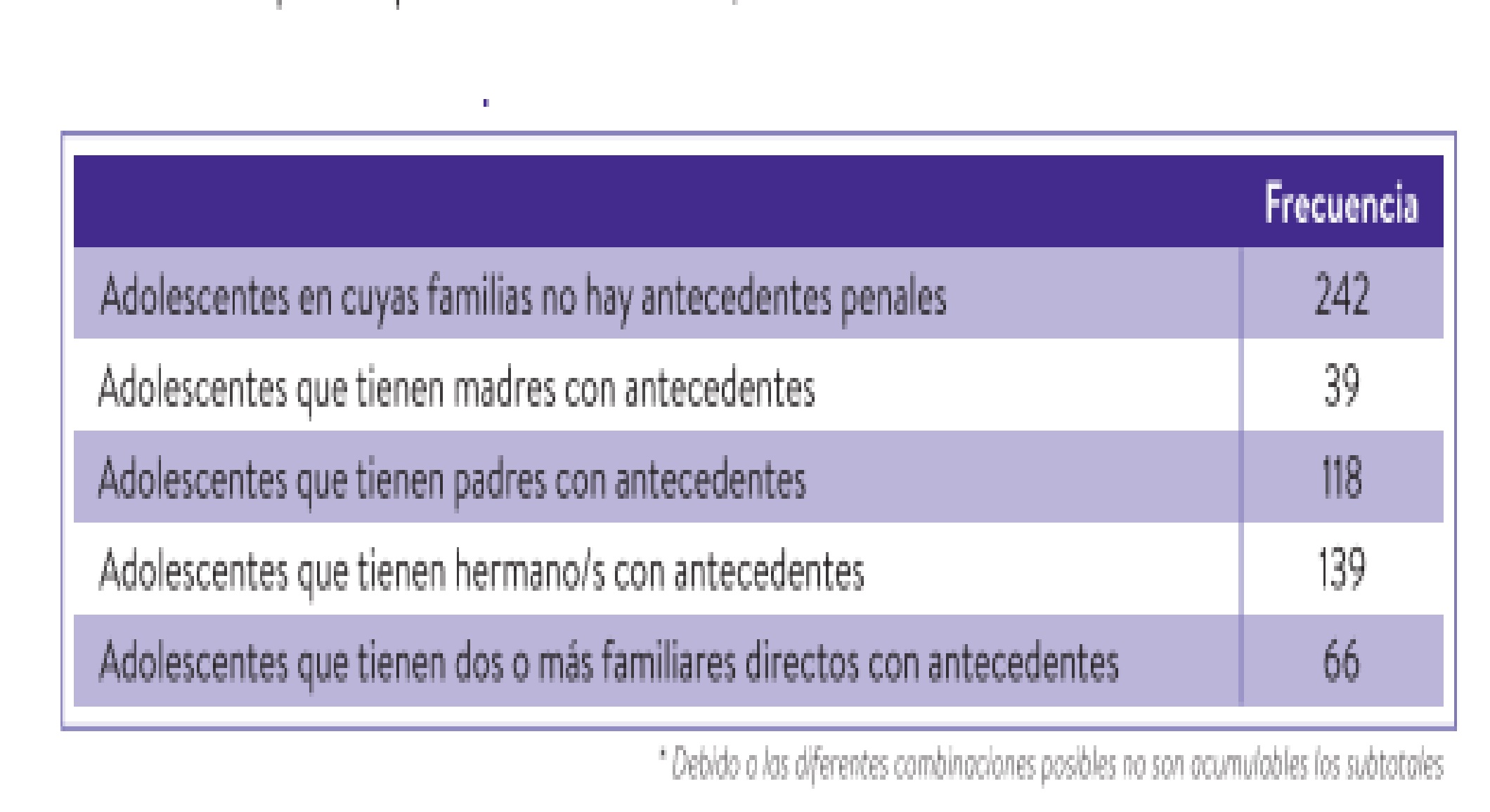 En lo relacionado a los antecedentes penales o infraccionales de los integrantes del núcleo familiar podemos observar un alto número de casos (242) de adolescentes que no presentan antecedentes de privación de libertad en su núcleo familiar.