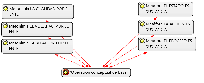 En la categoría “operación conceptual de base” se ubicaron la metáfora y la metonimia, con las siguientes subdivisiones: metáfora la acción es sustancia, metáfora el proceso es sustancia, metáfora el estado es sustancia, metonimia la cualidad por el ente, metonimia la relación por el ente y metonimia el vocativo por el ente. El dominio cognitivo de las entidades (sustancia/ente) se consideró la fuente conceptual de todas las nominalizaciones porque –como ya se ha señalado– el sustantivo prototípicamente designa una cosa (Langacker, 2008: 24).
