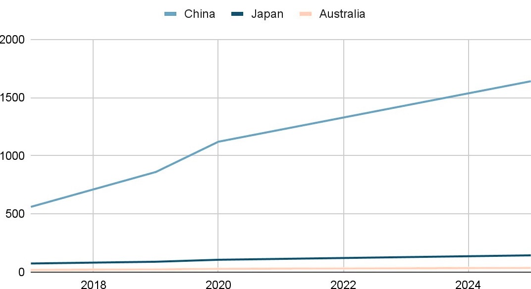 The provided chart illustrates the potential of e-commerce value and growth in China, Japan, and Australia from 2018 to 2024. China, a key RCEP member, demonstrates the most substantial expansion, with its e-commerce value tripling from $500 billion in 2018 to $1,500 billion in 2024. Japan and Australia also exhibit promising growth rates.