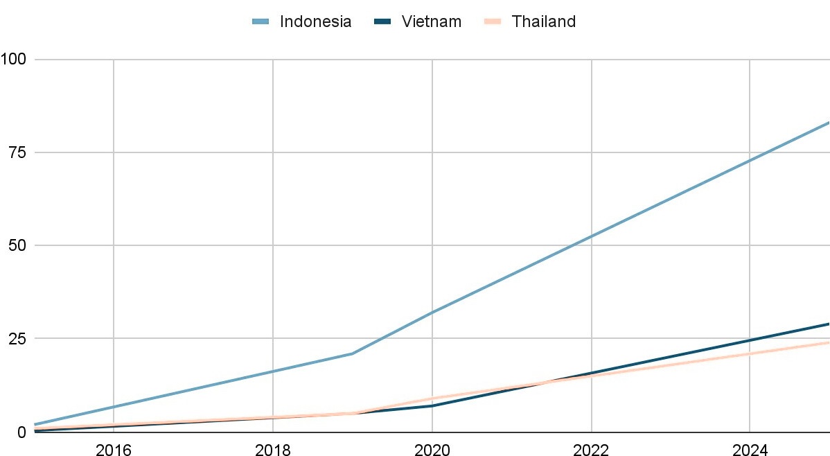 This given chart shows the potential of e-commerce value and growth in Indonesia, Vietnam, and Thailand from 2016 to 2024. It can be observed that Indonesia dominates e-commerce among the 3 countries, with its value surging from approximately $10 billion in 2016 to nearly $75 billion in 2024, a staggering 650% growth. While Vietnam and Thailand’s growth rates are lower at 500% and 200%, respectively, they still exhibit substantial expansion.