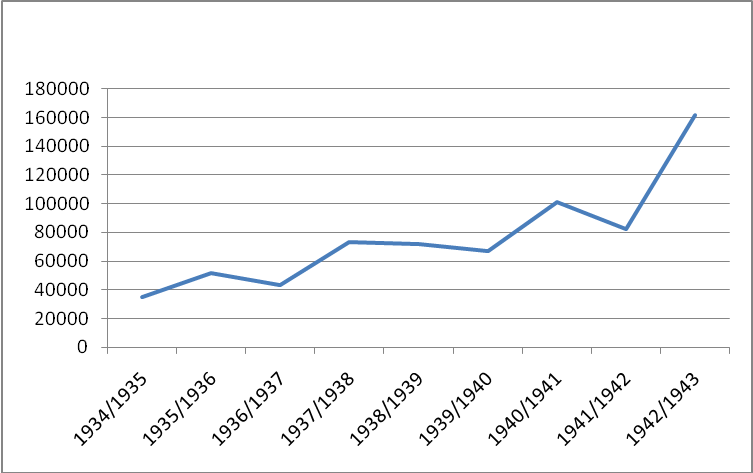 Aclaraciones: Los años comerciales son de julio de un año a junio del siguiente. Para el período 1939-1940 el cálculo es diciembre de 1939 puesto que en el verano de 1940 el granizó en el Sur mermó considerablemente la cosecha. Para las temporadas 1934-35 a 1939-40 la estimación es aproximada.