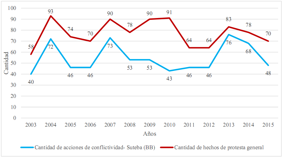 A partir de la comparación entre la conflictividad general en educación y la conflictividad específica de Suteba BB, pueden visibilizarse algunas cuestiones desarrolladas con más profundidad en los siguientes apartados. En primer lugar, en 2010 se observa un desacople entre la conflictividad general, que alcanza un pico importante (en este caso con reivindicaciones que provienen de otros sectores no sindicales como las comunidades educativas y estudiantes), en disonancia con las acciones de Suteba BB. Este desacople se debe a la situación de reflujo del movimiento docente sindicalizado, donde adquiere visibilidad el conflicto por establecimiento en torno a demandas de arreglos de infraestructura o problemas en niveles específicos (como en el nivel de educación especial o inicial). En segundo lugar, otro dato que surge es la caída pronunciada en 2015 de la conflictividad (con niveles inferiores a 2008- 2009) ante el escenario electoral presidencial y de expectativas por los cambios en educación.