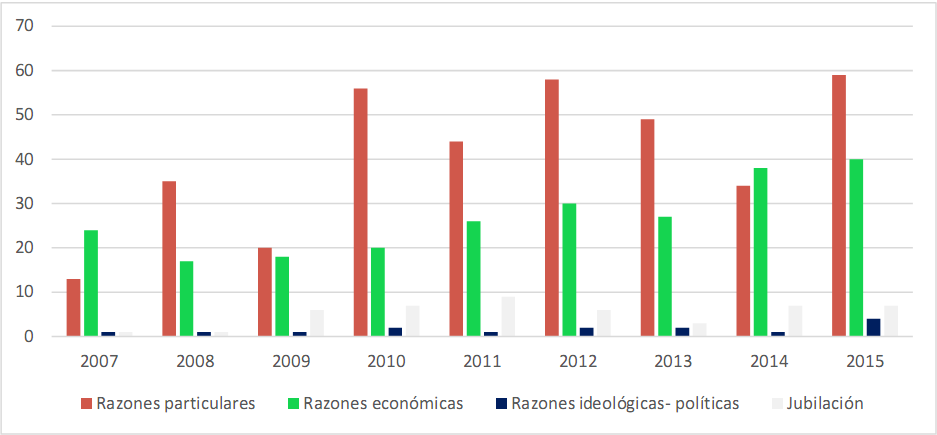 Respecto de los motivos de desafiliación, las categorías más utilizadas son cuatro: «razones particulares» (categoría que no permite acceder a motivos concretos); razones económicas (que incluyen, además, críticas hacia el coseguro y la obra social); razones políticas e ideológicas (que comprenden el trabajo político del gremio, su posicionamiento y medidas) y por último, el haber accedido a la jubilación (un factor coyuntural que transitan los afiliados)[54]. El gráfico 11 da cuenta de la magnitud de cada motivo de desafiliación. Como puede observarse, una gran mayoría esgrime, en primer lugar, razones particulares para explicar su desafiliación, y, en segundo lugar, aparecen motivos económicos. Las otras respuestas son relativamente menos relevantes desde el punto de vista estadístico. No obstante, es interesante observar la «aparición» desde 2009 de las razones «político‑ideológicas».