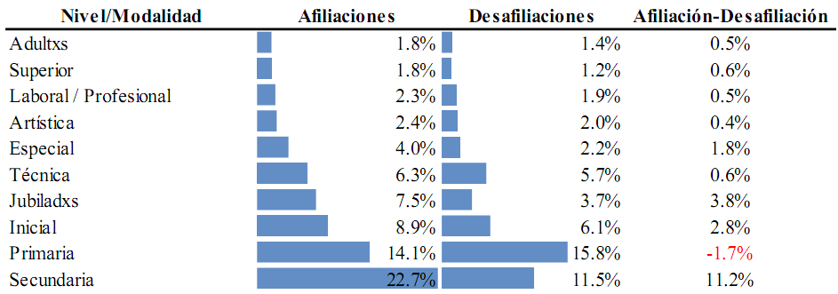 Excepto para el nivel primario, la tasa de afiliación neta (es decir, la diferencia entre afiliaciones y desafiliaciones) resulta positiva para el resto de las modalidades. El crecimiento vegetativo del sindicato se explica mayormente por los afiliados de nivel secundario, por los docentes jubilados, los de nivel inicial y especial.