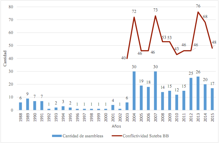 El análisis de los datos muestra que la conflictividad y las estrategias de Suteba BB atravesaron tres etapas distintivas y que se desarrollan en conjunción con otros factores, vinculados con el contexto político y económico. Una de las interpretaciones que se confirma es que la conflictividad y las formas de organización gremial muestran una correlación significativa: cuanto más amplia es la convocatoria y la organización de las acciones gremiales, más cantidad de hechos de conflictividad se generan. Aun así, estos procesos de correlación son contradictorios, no lineales y oscilantes en determinadas coyunturas (Cohen, 2011).