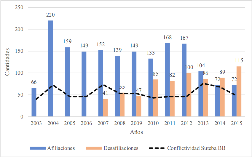 Fuente: elaboración propia basada en datos de afiliaciones y desafiliaciones de Suteba BB (2003‑2015)