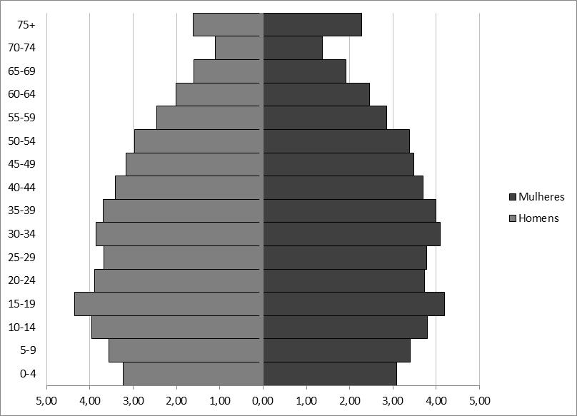 Em 2015, a razão de dependência jovem (0-14 sobre 15-64) era de 1 criança para cada 3 adultos (30%); a razão de dependência idosa (65+ sobre 15-64) era de 1 idoso para cada 6 adultos (15%) e a razão de dependência total (0-14 e 65+ sobre 15-64) era de 1 pessoa dependente para cada 2,2 pessoas em idade ativa (44%). Essas razões demonstram o momento de janela de oportunidades aberta pela dinâmica demográfica.