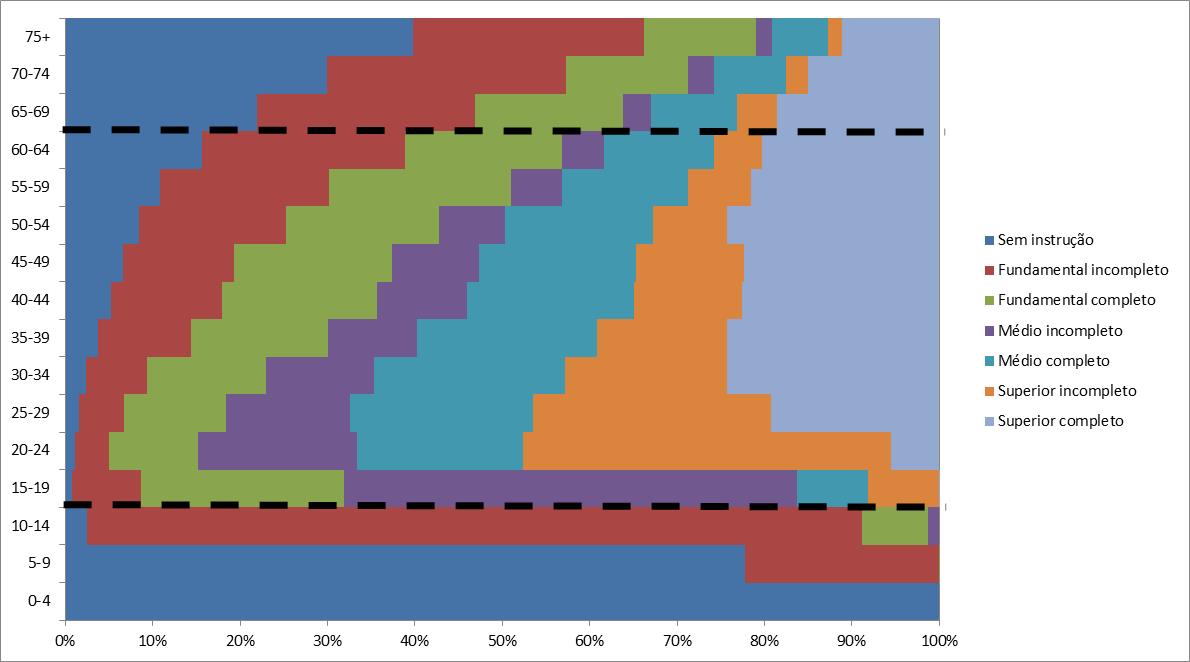 Quanto ao nível de escolaridade máximo alcançado, em 2015 a população brasileira tinha a seguinte distribuição (Figura 4). As linhas pontilhadas separam o grupo de pessoas dependentes daqueles em idade ativa (15-64 anos):