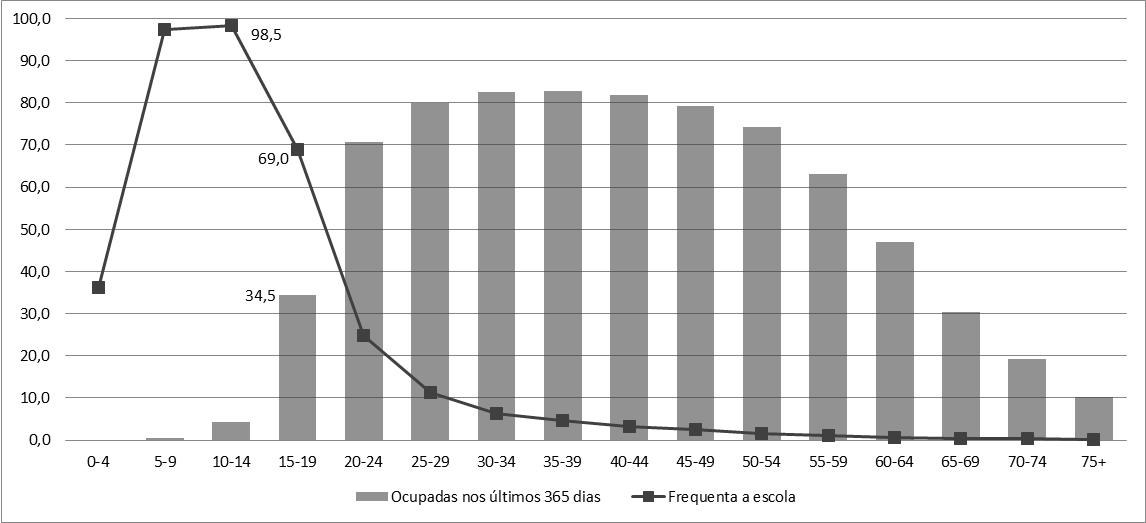 Quanto ao acesso à educação, o gráfico abaixo (Figura 5) indica a proporção de pessoas que frequentavam algum estabelecimento de ensino (creche, escola, faculdade) e a proporção de pessoas ocupadas, segundo grupo etário:
