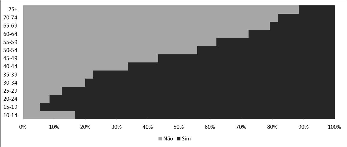 A Figura 6 indica o percentual de pessoas que utilizam ou já utilizaram a internet. No total, os usuários da rede respondem por cerca de 60% da população pesquisada. As faixas mais escuras indicam aqueles que utilizam/já utilizaram essa tecnologia. A maior parte dos usuários concentra-se nas idades mais jovens (recordando que a pesquisa capta a informação para pessoas com 10 de idade ou mais), reduzindo-se gradativamente conforme aumenta a idade.