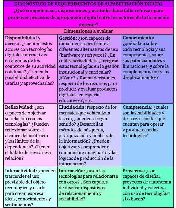 Roxana Cabello (2013), en su libro Migraciones digitales: Comunicación, educación y TD interactivas, elabora una guía para el diagnóstico institucional del grado de madurez digital de una institución y los requerimientos para lograr una alfabetización digital de un espacio educativo concreto. En la presente tesis, en los capítulos 5 y 6, tomaremos ese modelo como base para realizar parte del análisis del uso y AdT que se realiza en el instituto bajo estudio. Cabello, para definir el modo de diagnosticar los requerimientos de formación necesaria en las instituciones educativas, toma como punto de partida las dimensiones de la AdT desarrollada por Morales, que hemos presentado en este mismo capítulo. El resultado de esta sistematización es resumido por la autora en el siguiente gráfico: