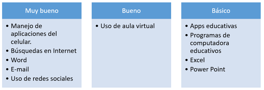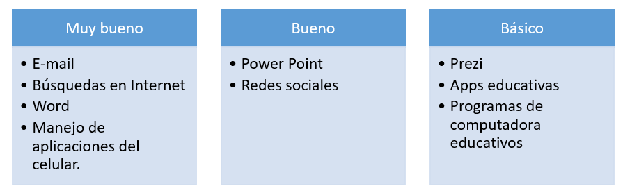 A continuación, presentaremos las principales coincidencias halladas en torno a la habilidad para el manejo de tecnologías en docentes y estudiantes. En todos los casos se toman las respuestas más elegidas por cada grupo en la escala de Likert, de acuerdo al siguiente orden: Muy bueno, bueno, básico y no sé usarlo.