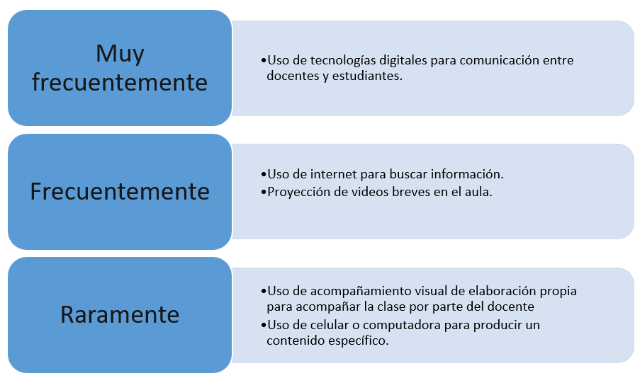 Entre los usos definidos por la mayoría de los docentes como frecuentes están aquellos relacionados con el Internet. El 49,2% de los encuestados sostuvo que frecuentemente solicita a sus estudiantes que usen sus celulares para buscar información en internet. Por otra parte, la proyección de videos breves en el aula fue también caracterizada por la mayor parte de los docentes como frecuente en sus clases (40,7%) y el uso de la netbook o computadora en el aula (32,2%).