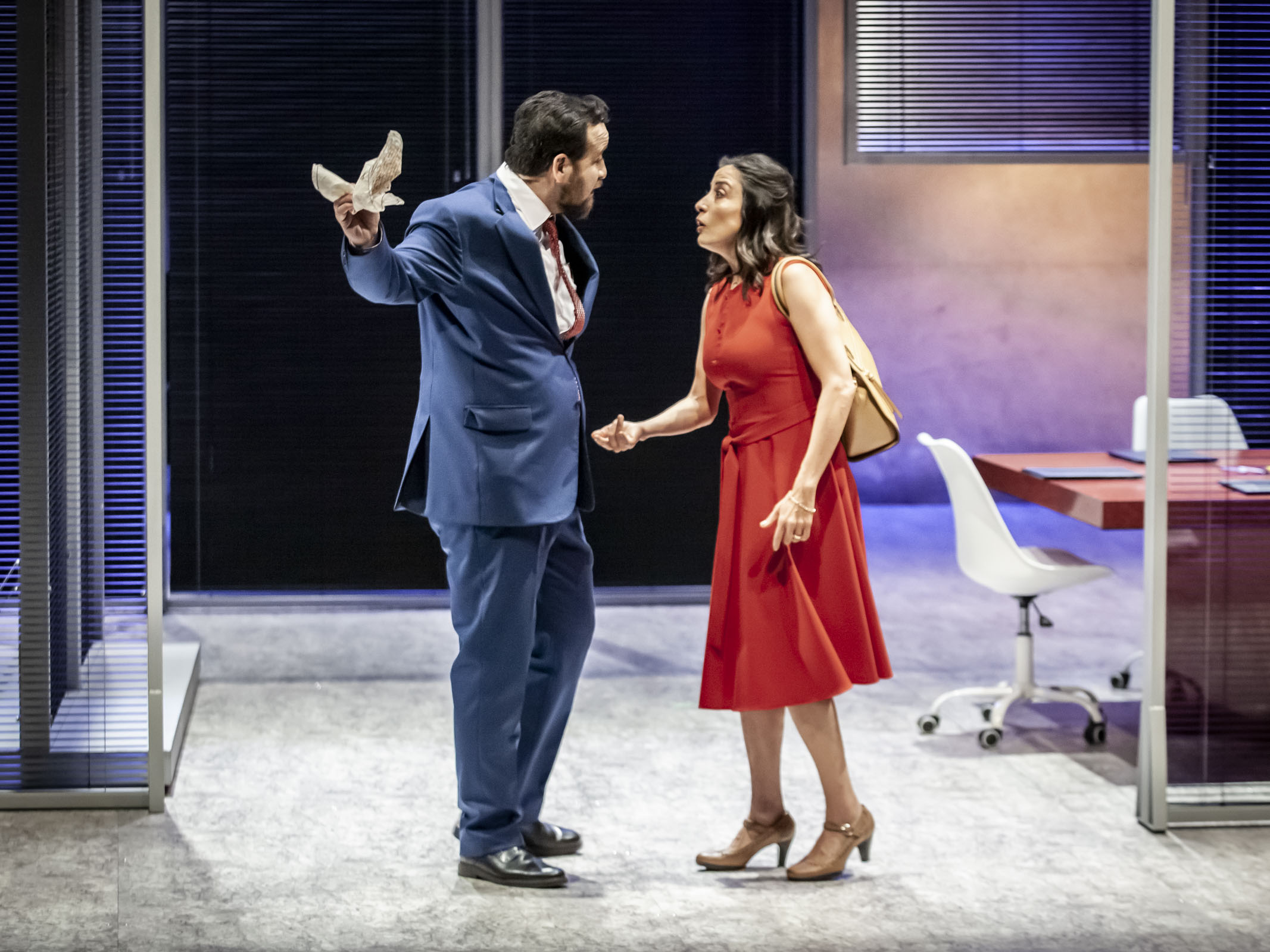 En este conjunto, compuesto y variado, se sitúa la obra de Andrea Salmerón Sanginés. Si, como todo espectador y espectadora sabe, Otelo es un general moro al servicio de la República de Venecia que se une en matrimonio con Desdémona, la joven hija del senador Brabancio, y que, tras recibir órdenes de trasladarse a Chipre, nombra al joven Cassio su lugarteniente, lo que despierta el resentimiento del alférez Iago, en cambio La maté por un pañuelo ya no se desarrolla en la hermosa ciudad italiana sino entre diputados y gobernadores de la Ciudad de México. Las dinámicas de violencia, celos e intrigas, aun permaneciendo casi idénticas a la historia original, se ajustan a la circunstancia política del presente, tanto en la escenografía y los vestuarios como en la modernización del lenguaje, que no solo se aleja de las traducciones clásicas al castellano, sino que reproduce el registro xenófobo y misógino de las oficinas del Congreso de la nación.