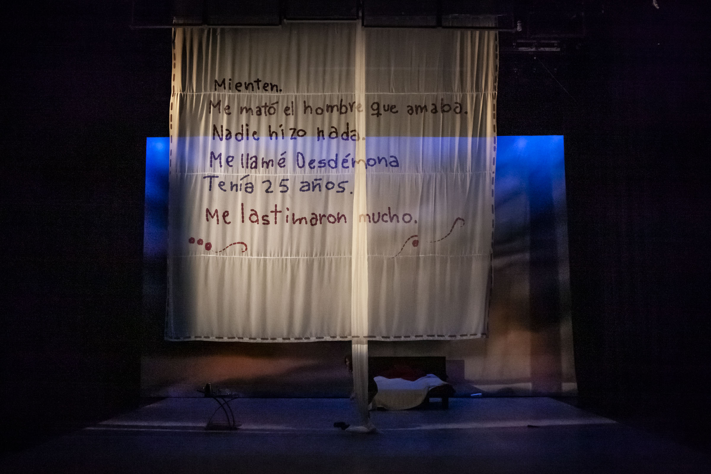 A diferencia de cierto tipo de cine y periodismo, que parece interesado más en la espectacularización de la violencia que en la catástrofe humana que esta produce, La maté por un pañuelo constituye una herramienta de investigación y cuestionamiento para los cuerpos bajo asedio. A partir del estudio del lenguaje y de sus implicaciones sociales y políticas, la autora reescribe la tragedia que tuvo lugar entre 1601 y 1603, elaborando una propuesta escénica que revisa uno de los grandes clásicos de la tradición occidental para poner de relieve el cortocircuito ético del texto shakespeariano. Readaptada por estilo y ambientación a la realidad mexicana contemporánea, se trata de una pieza que, por su lengua misógina y machista y sus directas referencias a ciertos personajes de la crónica nacional, pretende sacudir a espectadoras y espectadores sobre el estado de excepción que, a raíz de la naturalización de la violencia de género, ya se ha vuelto norma. La Desdémona del Bardo, literalmente matada por un pañuelo, proyecta en la Desdémona de Salmerón Sanginés las sombras de todas las muertas no-llorables que en el país alcanzan un promedio de 11 mujeres al día.