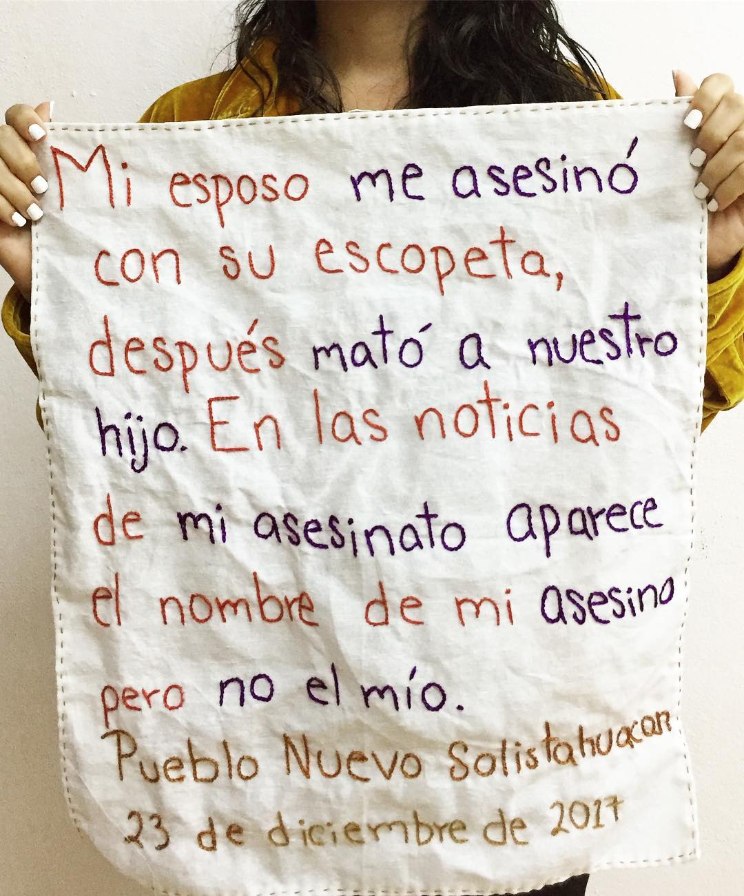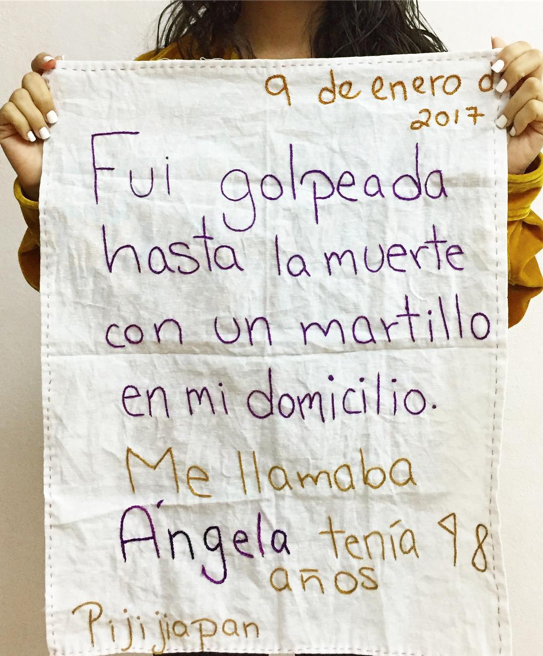 Bordamos en el camión, en el café, en la fila del banco, donde podemos –explica Minerva Valenzuela. No sólo es un pedazo de paño terminado […]. Es una manera de traerlas de vuelta al mundo y de honrar su memoria. De devolverles un espacio físico en la tela y el tendedero de donde colgarán las telas con sus casos para que los ojos de todos las lean, las conozcan y sepan por qué ya no están entre nosotras[29].