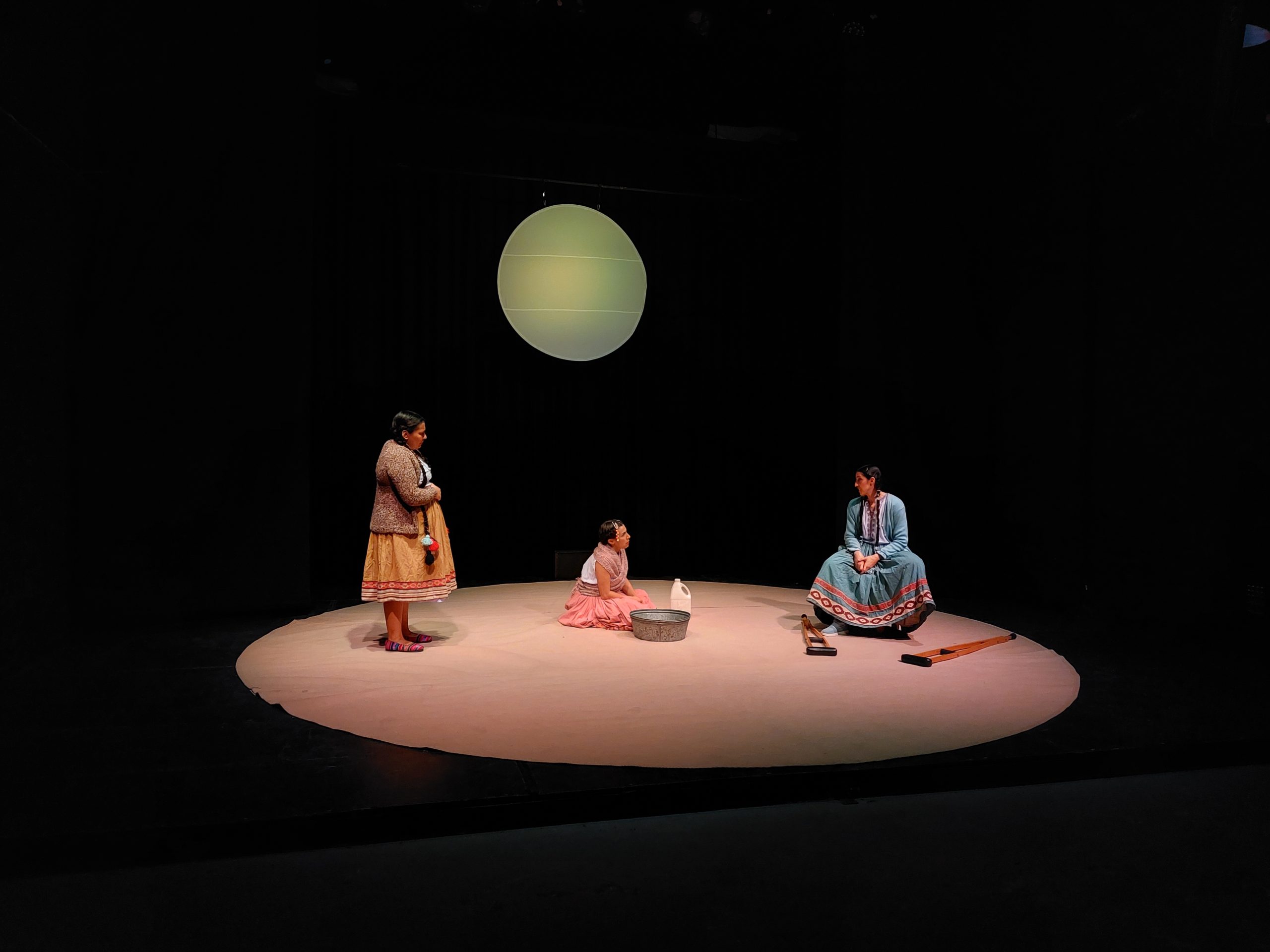 La luz, siempre es la luz. Creo que en esa expresión de lo visual se logra casi todo. Tengo la suerte, desde hace muchos años, de trabajar con el diseñador lumínico Julio López con el que compartimos una mirada común sobre los materiales que abordamos. Por otro lado, el diseño escenográfico que desarrollamos junto al escenógrafo chileno Gustavo Acevedo terminó de armar el concepto. El tapete circular que contiene la obra y el círculo que baja y sube por el foro son todos los espacios:  los días, las noches, los años y el tiempo que transcurre. El color del círculo es arena y es la montaña donde la pastora pierde a su hijo, pero también es el piso de la cárcel dónde ella se sienta. La luz delimita los espacios y genera las mañanas, los atardeceres y las noches. La última trama la da el sonido, que es el viento del desierto, el pasado antes de la tragedia, la música de batalla o el ritual de sacrificio. El vestuario (también de Gustavo Acevedo) tiene cambios muy sutiles durante la obra. Las tres Aymaras van cambiándolo entre ellas y la pastora va trabajando el despojo de sus capas con las que llega a la cárcel para volver a construirse en la escena final donde ocurre la reconstrucción del hecho. Los vestuarios, en el final, también se convierten en la morfología del espacio, en las montañas y los caminos de la reconstrucción. En esta puesta, todo lo que entra en escena está al servicio de contar la historia de Gabriela Blas Blas y el abuso que sufrió por parte del estado que la condenó por ser Aymara, mujer y pobre (Bendersky y Di Matteo, 2025).
