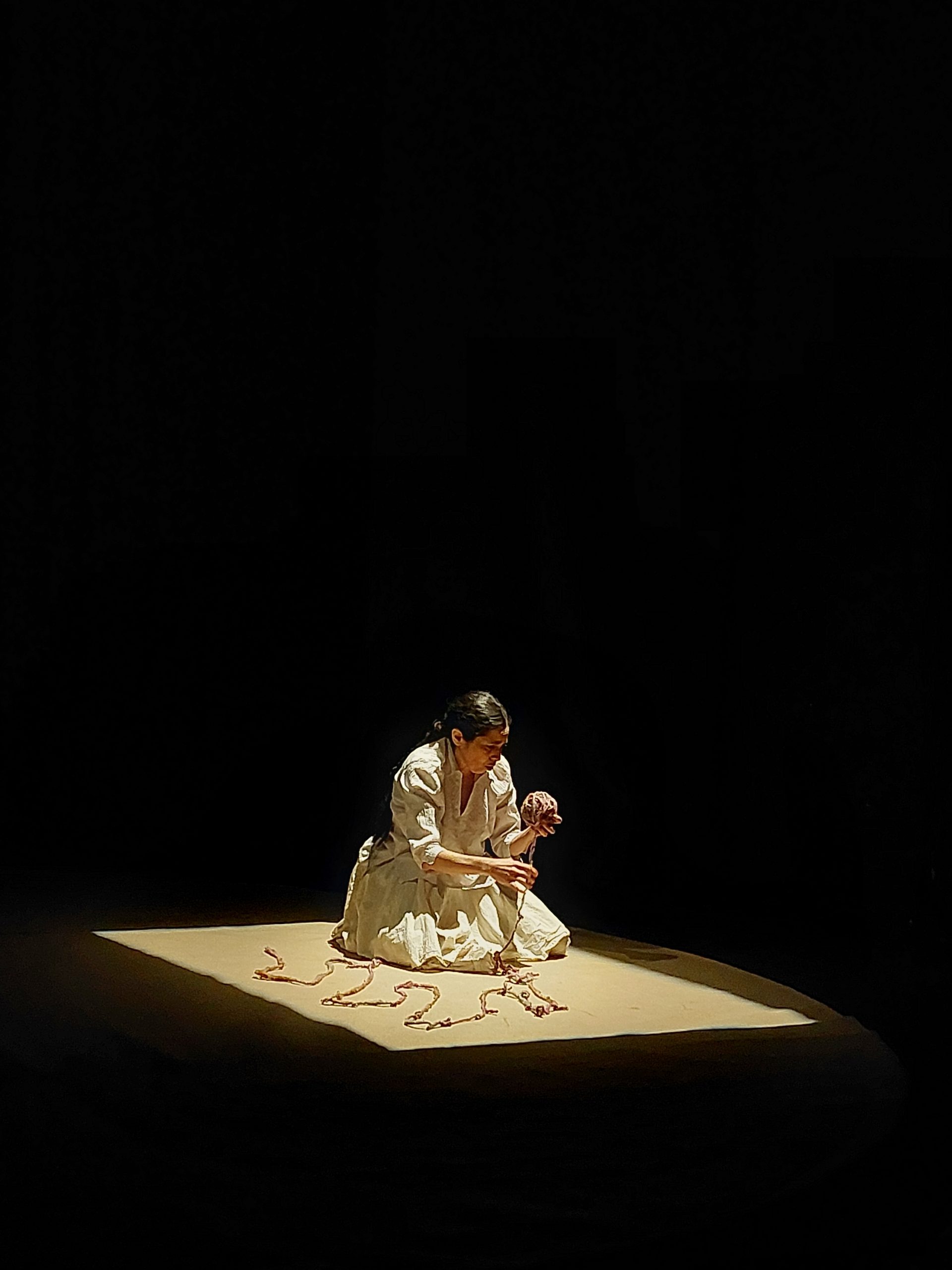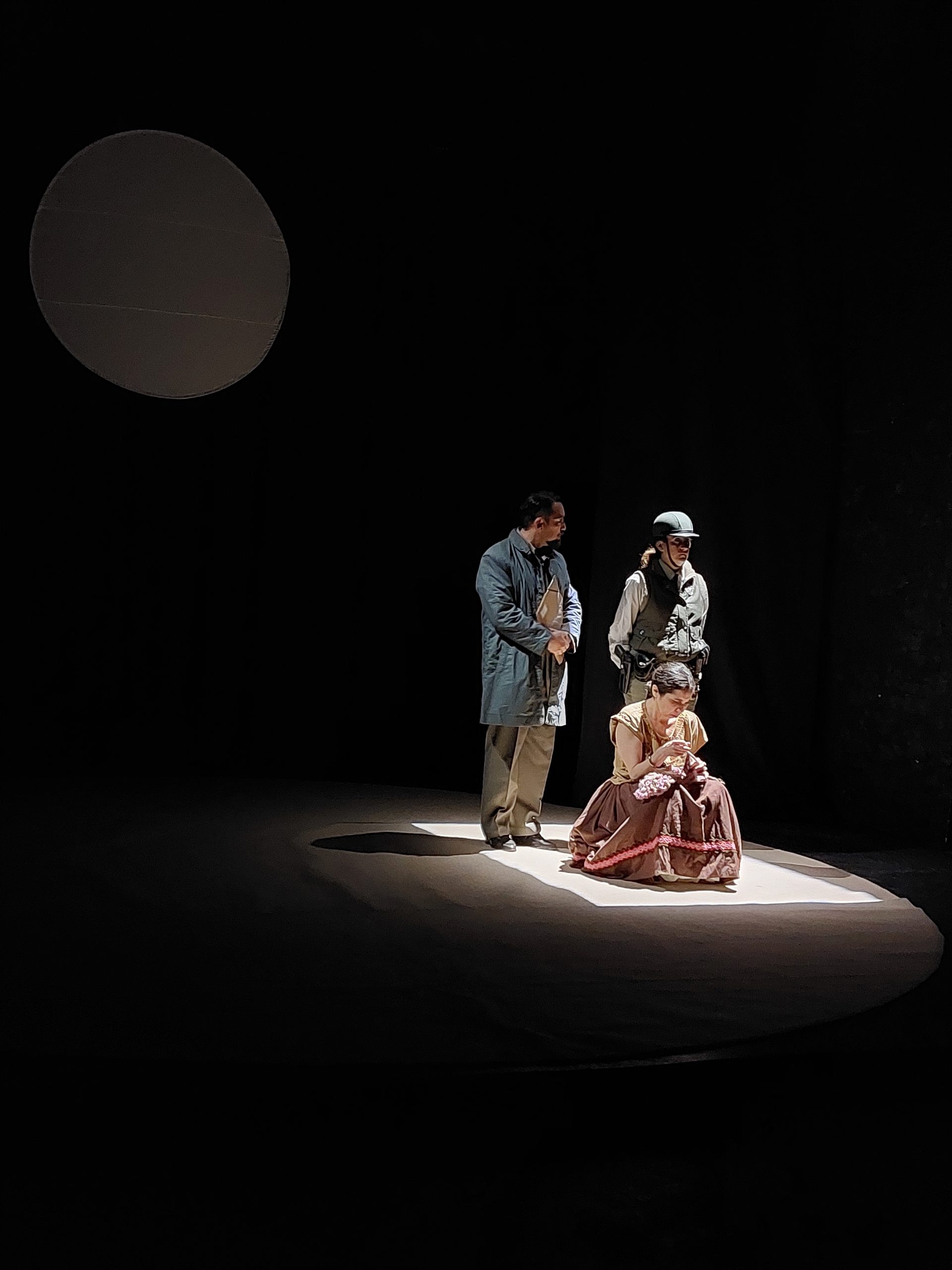 Por lo tanto, la obra se organiza entre dos espacios: el espacio diminuto y silencioso de la celda de Gabriela donde ella, según comenta en una entrevista Mariela Kantor, la actriz argentina que la interpretó en Buenos Aires, “no tiene ni lugar donde sentarse, solo se tiene a ella, lo que le queda de ella, se sienta sobre ella misma, se autosienta”[10], y el espacio de la calle, donde la comunidad indígena se reúne para organizar ollas comunes, para manifestar y denunciar las violencias del Estado.