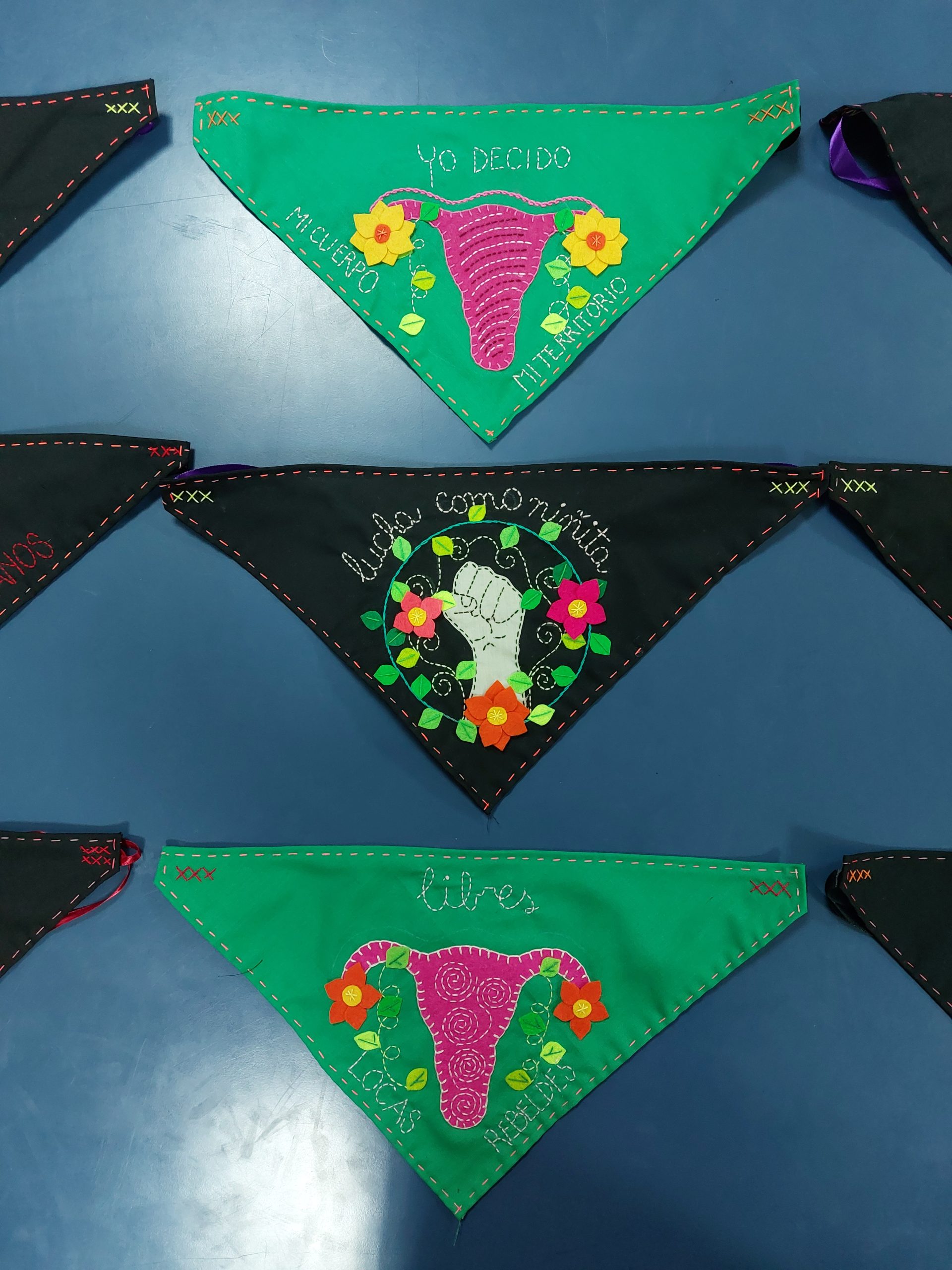 Hace más de 10 años que bordamos pañoletas. Bordar una pañoleta tiene un sentido político, la usamos porque vamos a las marchas y no protegen del gas lacrimógeno. Es a la vez la metáfora de usar una pieza sobre la boca: hablar con una palabra bordada. Hemos compartido el oficio de bordar arpillera de manera gratuita para apoyar muchas luchas alrededor del mundo. Estudiantes de post grado vienen a nuestro taller de todas partes del mundo para aprender el oficio. Somos invitadas a hablar de nuestro trabajo en la calle por museos, universidades y organizaciones sociales de todas partes del mundo. Tenemos una comunidad de 170 alumnas alrededor del mundo que aprenden a bordar para luchar, no solo para vender en una tiendita[32].