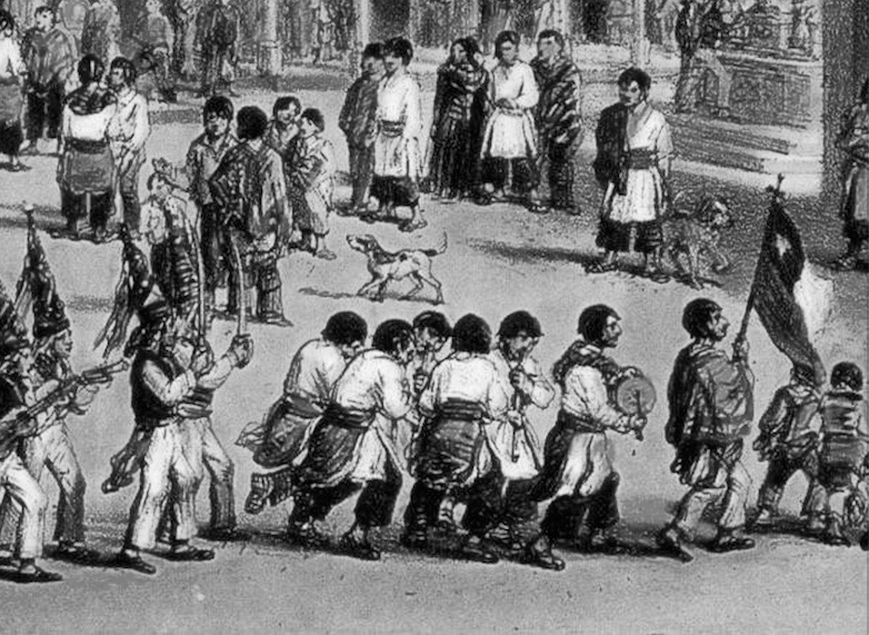 - Este proceso comenzó a ocurrir con fuerza en el siglo xix para el actual territorio argentino, abarcando primero las actuales provincias de San Juan y las de Cuyo, aunque luego en el siglo xx se desplegó en zonas como La Rioja, o incluso Neuquén, aunque principalmente a través del culto devocional andacollino, y no siempre con la formación de colectividades de chinos. En el caso trasandino, vistos desde un punto de vista estilístico, los bailes chinos se presentan con variaciones significativas, combinando elementos de las colectividades de flauta, tambor y bandera, que son lo que en Chile se conoce como “bailes chinos”, y algunos otros rasgos de los llamados “bailes de turbantes” y “bailes de danzas”, formaciones organizadas por la Iglesia chilena a mediados y fines del siglo xviii con base en una orquestación musical y vestimenta que los acercaba al estamento español (guitarras, panderos, etc., ver imagen 1), de modo de hacer frente a la devoción de los chinos o indios. En anteriores trabajos hemos abordado las distinciones estilísticas actuales e históricas entre estas cofradías andacollinas del Antiguo Régimen, así como su confluencia organizacional y de expresividad devocional con los bailes chinos ya hacia mediados del siglo xix, en cuanto a lo popular y lo indomestizo, debiendo revisarse especialmente Contreras, González y Peña (2011: 145-181) y Contreras y González (2014: 105-173).↵